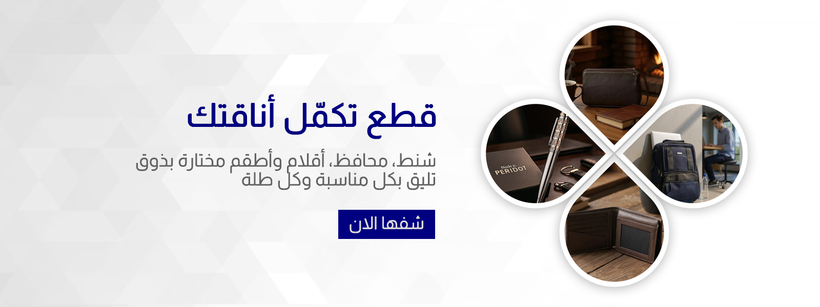 في متجرنا، نؤمن إن التفاصيل هي اللي تصنع الفرق. اخترنا لك بعناية تشكيلة تجمع بين الفخامة، العملية، والجودة العالية — من شنط جلد راقية، لمحافظ أنيقة، لأطقم وأقلام تضيف لمسة ذوق على يومك. كل قطعة عندنا تنقال فيها "ذوقك راقٍ". نشتغل بشغف على إنك تلقى اللي يناسبك، سواء هدية فاخرة أو قطعة تكمّل أناقتك. معنا… تميزك يبتدي من التفاصيل.
