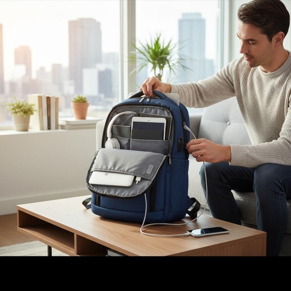 تتميّز الشنطة بوجود منفذ USB خارجي مدمج يسمح لك بشحن أجهزتك الإلكترونية بسهولة أثناء التنقل (يتطلب توصيل باور بانك داخلي) ، كما أنها تحتوي على عدة جيوب داخلية وخارجية لتنظيم اللابتوب ، الشاحن ، الكتب ، المستندات ، والإكسسوارات بطريقة مرتبة وسهلة الوصول
